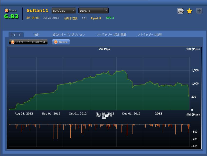 下記図は2012年8月からの実績ですがボラティリティ(変動性)が高くなって以降、良いとこ無しです。ミラートレーダーのストラテジーはバックテストが出来ない為、稼動実績が1年未満のストラテジーは異なる相場環境での実力がテスト出来ない為、注意が必要で、期間が短いと偶々結果が良いものが「トップセレクト」や「トップT-Score」にランクされ、相場環境が変わるとボロボロになる良い例でした。